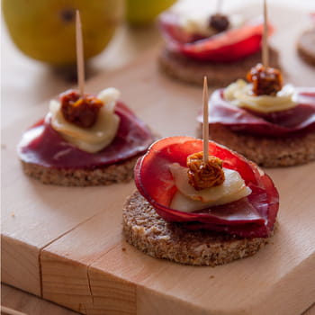 Crostini di pane nero bresaola, pera e bacche di Physalis